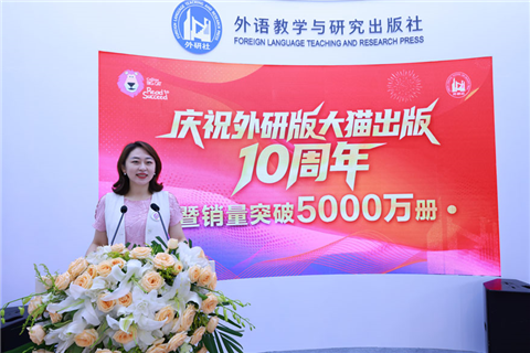 外研社党委副书记陈媛媛在“外研版大猫出版10周年暨销量突破5000万册”庆典活动上致辞