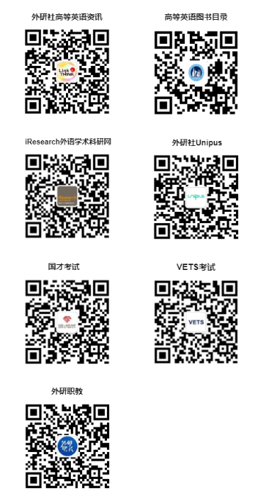附:请根据需要,扫描以下二维码,关注“外研社高等外语教育”系列微信公众号,第一时间获取教育教学资讯及教学科研资源。