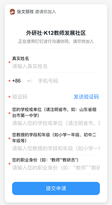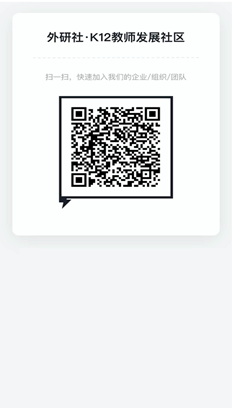 本系列在线培训通过 “外研社·K12教师发展社区”进行。请您于7月31日18:00前,下载钉钉手机APP并使用钉钉扫描下方二维码,填写相关信息,申请加入“外研社·K12教师发展社区”。工作人员将根据备注邀请您进入相应群中,届时您在群中可完成直播收听。