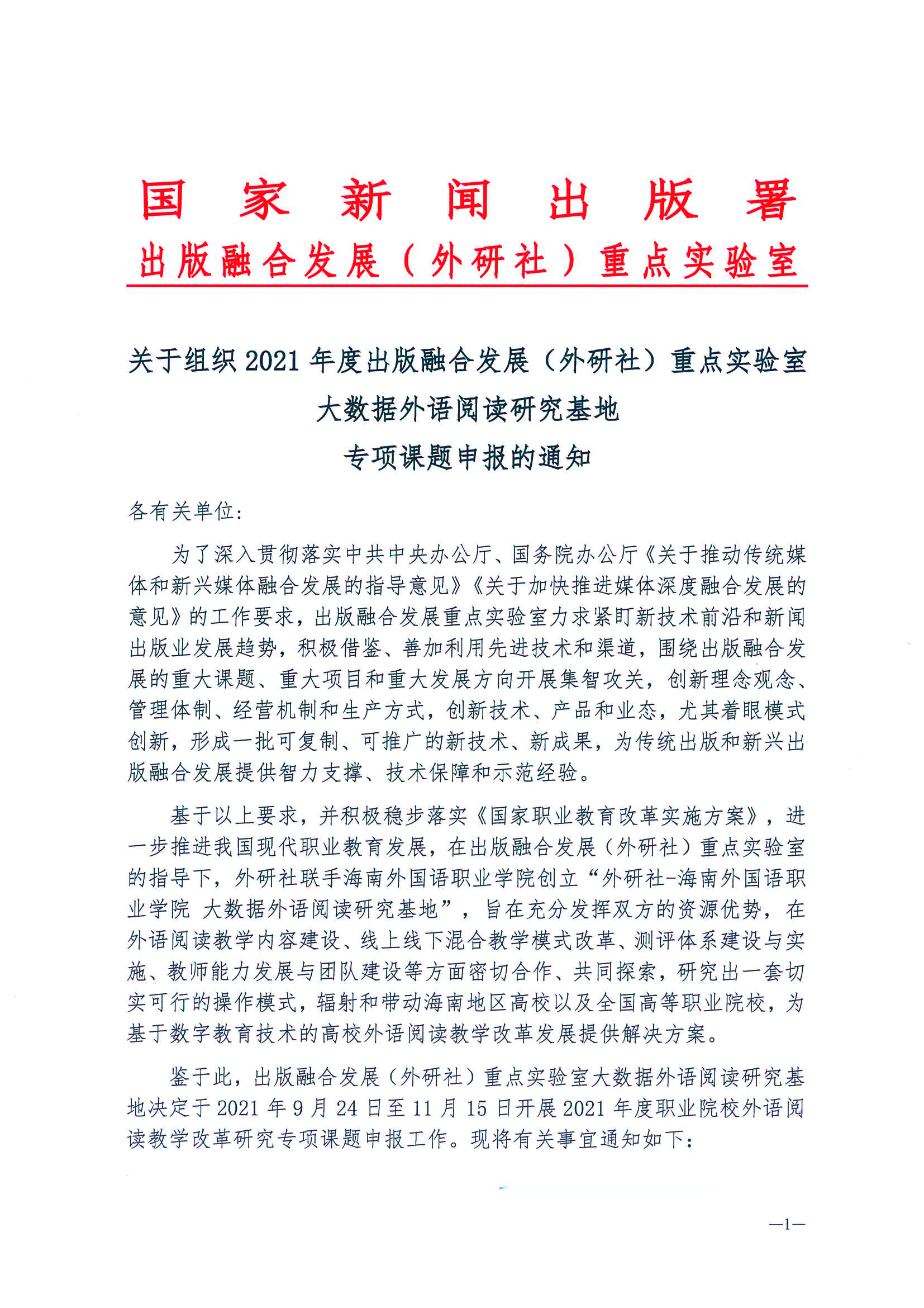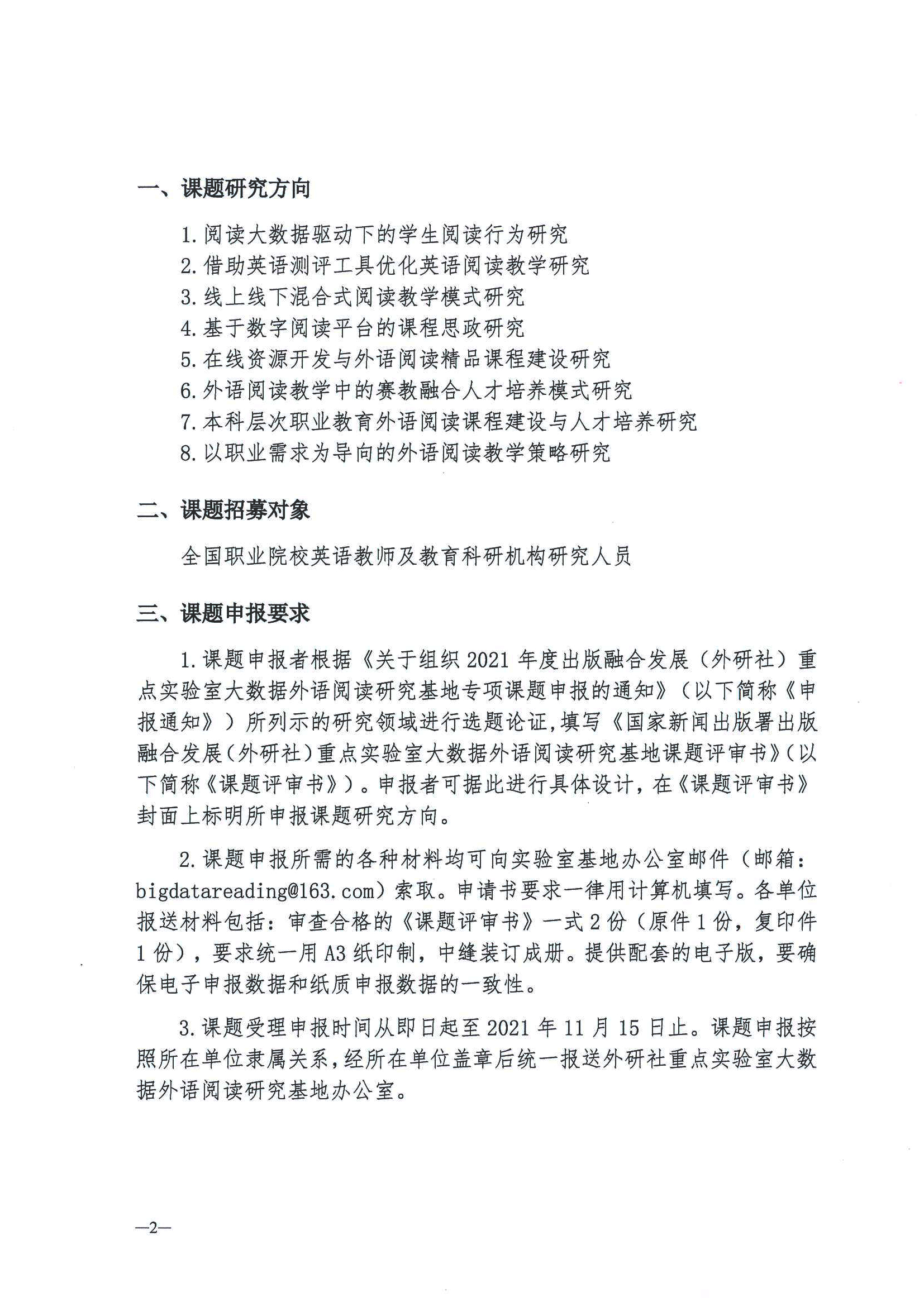 关于组织2021年度出版融合发展(外研社)重点实验室大数据外语阅读研究基地专项课题申报的通知