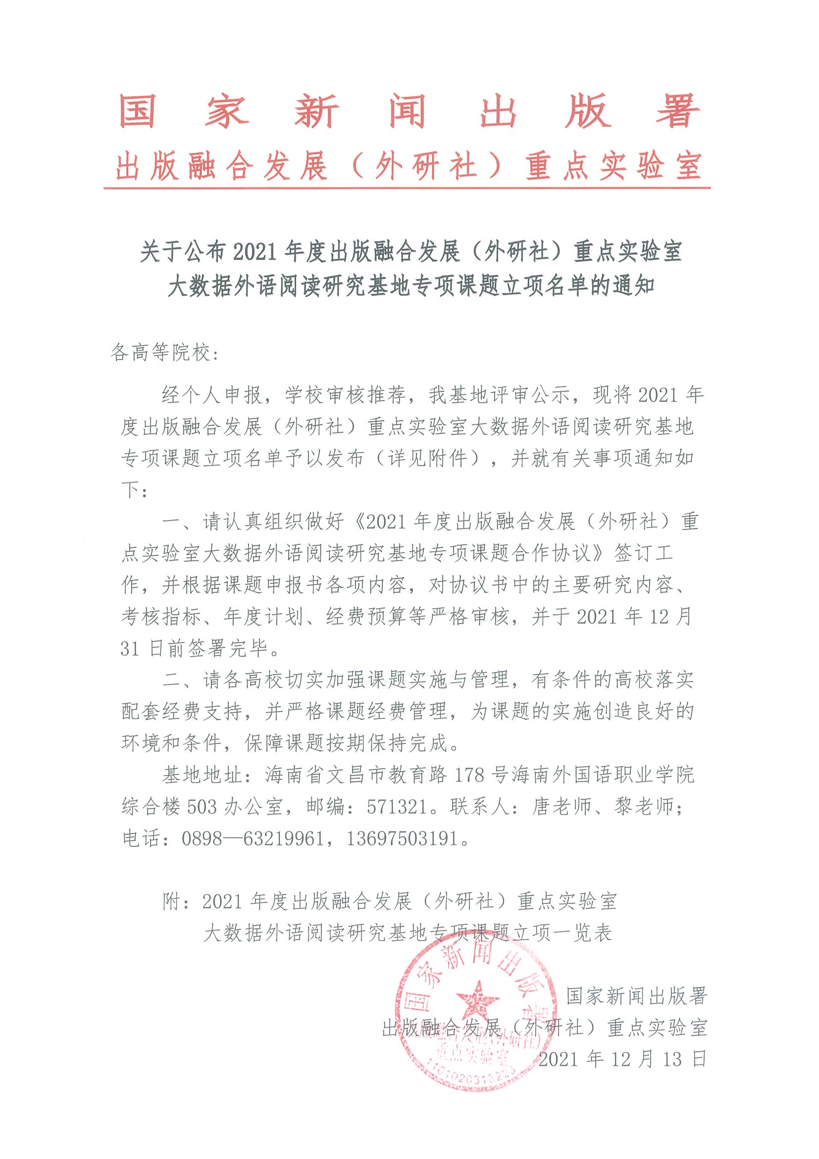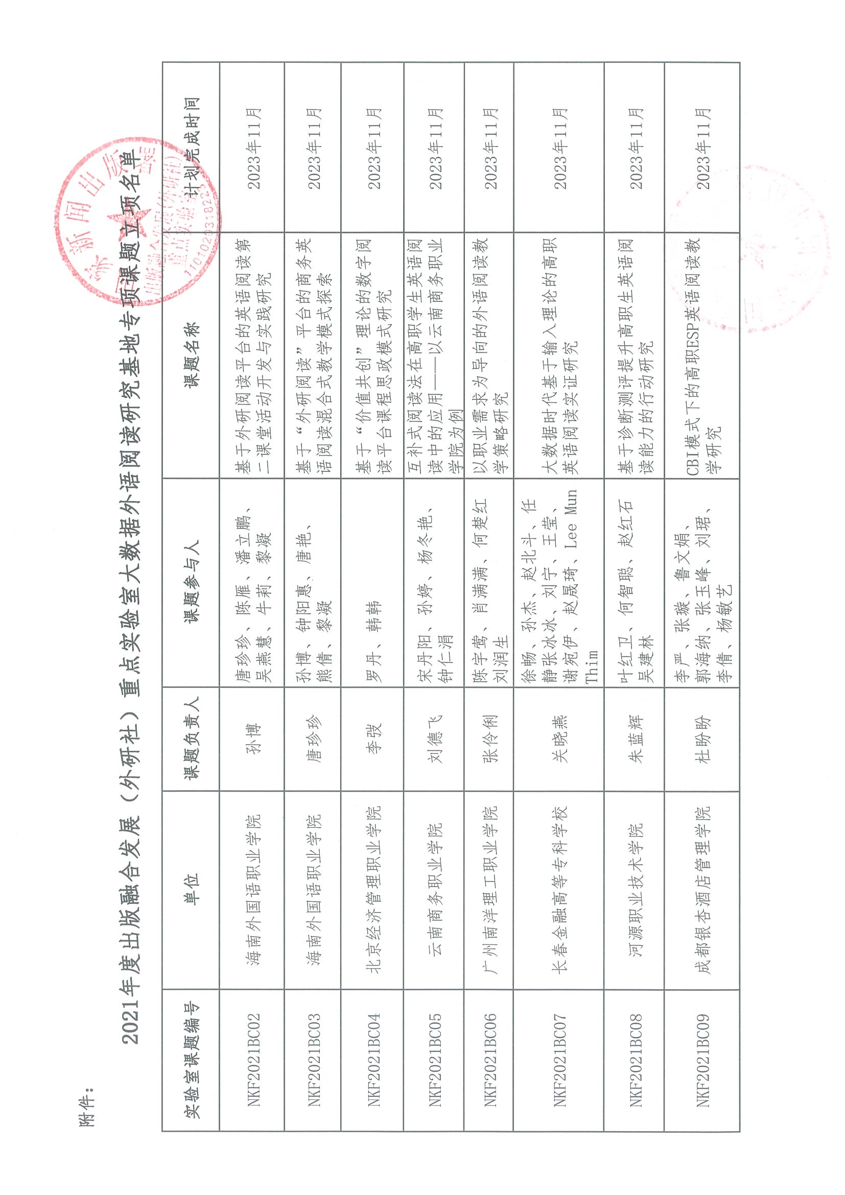 关于2021年度出版融合发展(外研社)重点实验室大数据外语阅读研究基地专项课题立项名单的通知