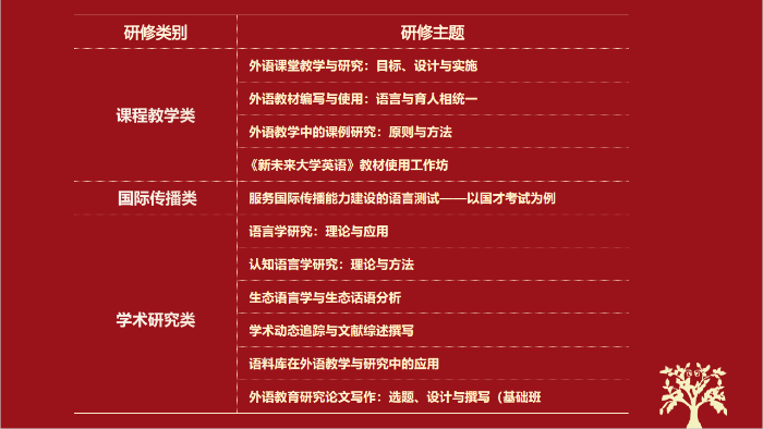 全国高等学校外语学科中青年骨干教师高级研修班涵盖课程教学、学术研究、国际传播三大类别,匠心打磨11期研修内容,超4,000位一线教师在学习中领悟教育理念,在实践中精进研究能力,在教研中提升专业发展。