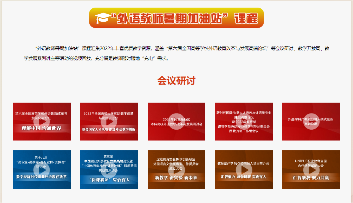 “外语教师暑期加油站”课程提供2022年8场高等外语教育领域重要会议,2场教学开放周以及10场教材解读与教学实践讲座等精品内容,即时形成暑期研修回放视频,助力教师随时随地开启“充电”之旅。