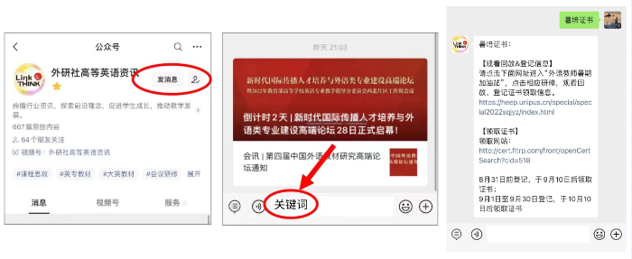 关注外研社高等英语资讯微信公众号,在【发消息】界面回复关键词“暑培证书”,获取证书领取方式。