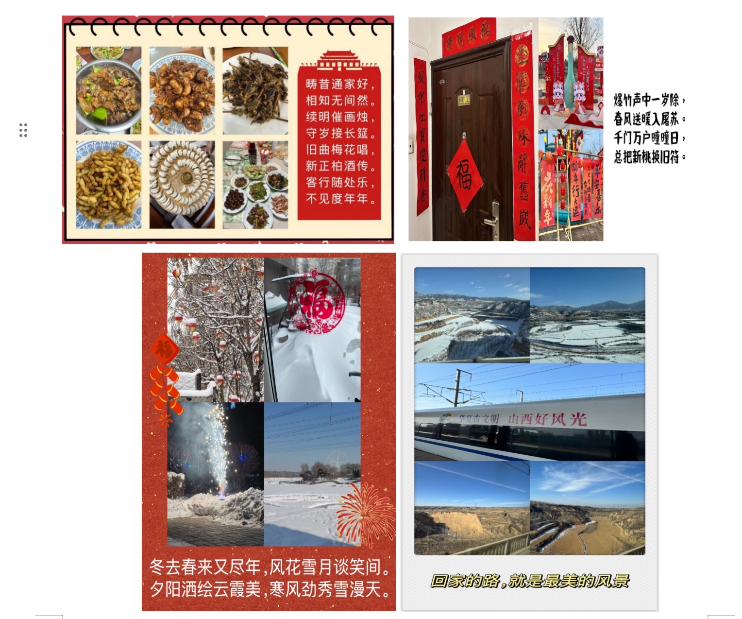 春节期间,第一和第七支部的党员们与家人共度美好时光,无论是回到家乡还是游览祖国大好河山,都用心去感受了生活的美好、祖国的强盛。大家拿起相机,捕捉了那些让人心动、心喜的瞬间。无论是家乡的年俗风情,还是祖国各地的秀美景色,都不仅是个人的美好回忆,更是新时代伟大成就的生动缩影。党员们还为这些照片配上诗话,以更生动的方式表达对祖国的热爱与对生活的感悟。