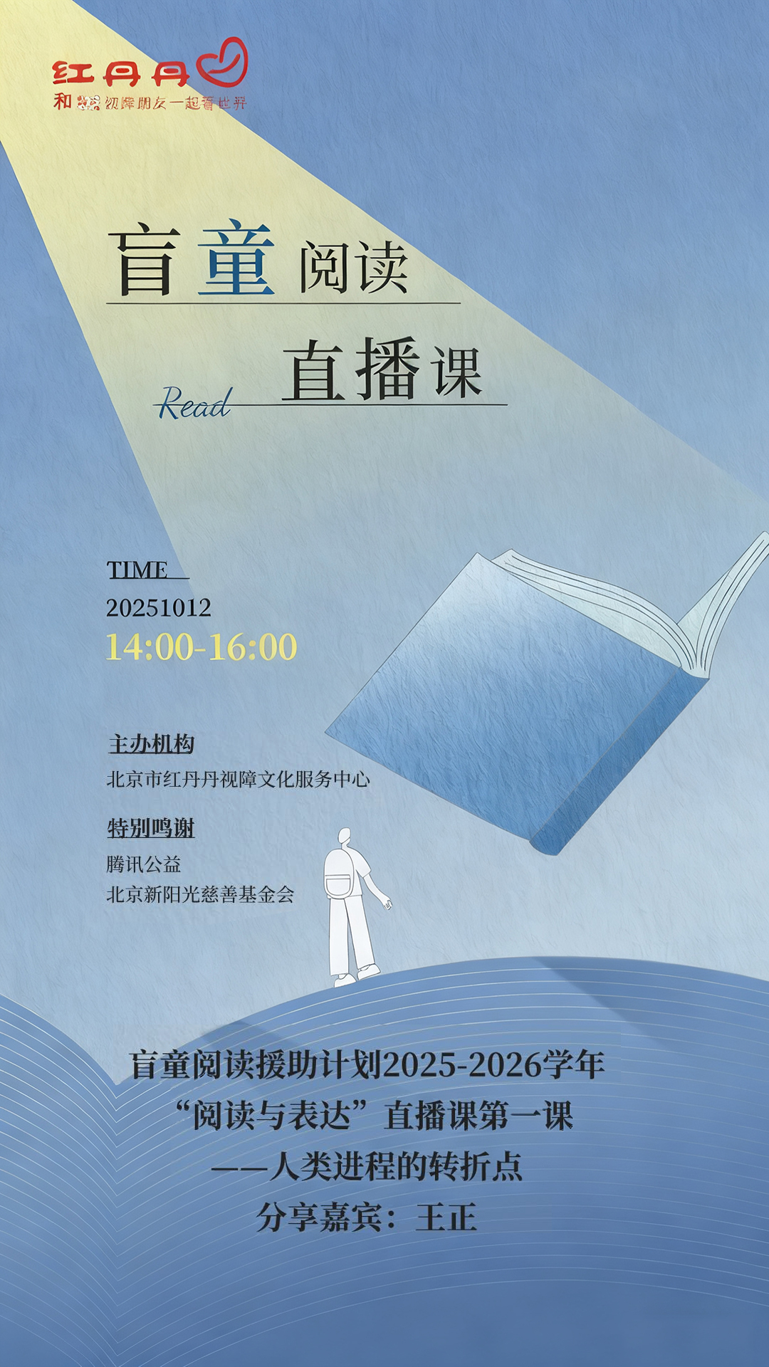 为切实满足广大盲生的阅读学习需求,助力视障群体共享阅读教育资源,2025年10月12日,外研集团(外研社)党委第十九党支部联合北京市红丹丹视障文化服务中心(以下简称“红丹丹”)启动“盲童阅读援助计划2025-2026学年‘阅读与表达’直播课”活动,为全国盲生带来主题为“人类进程的转折点”的直播课。