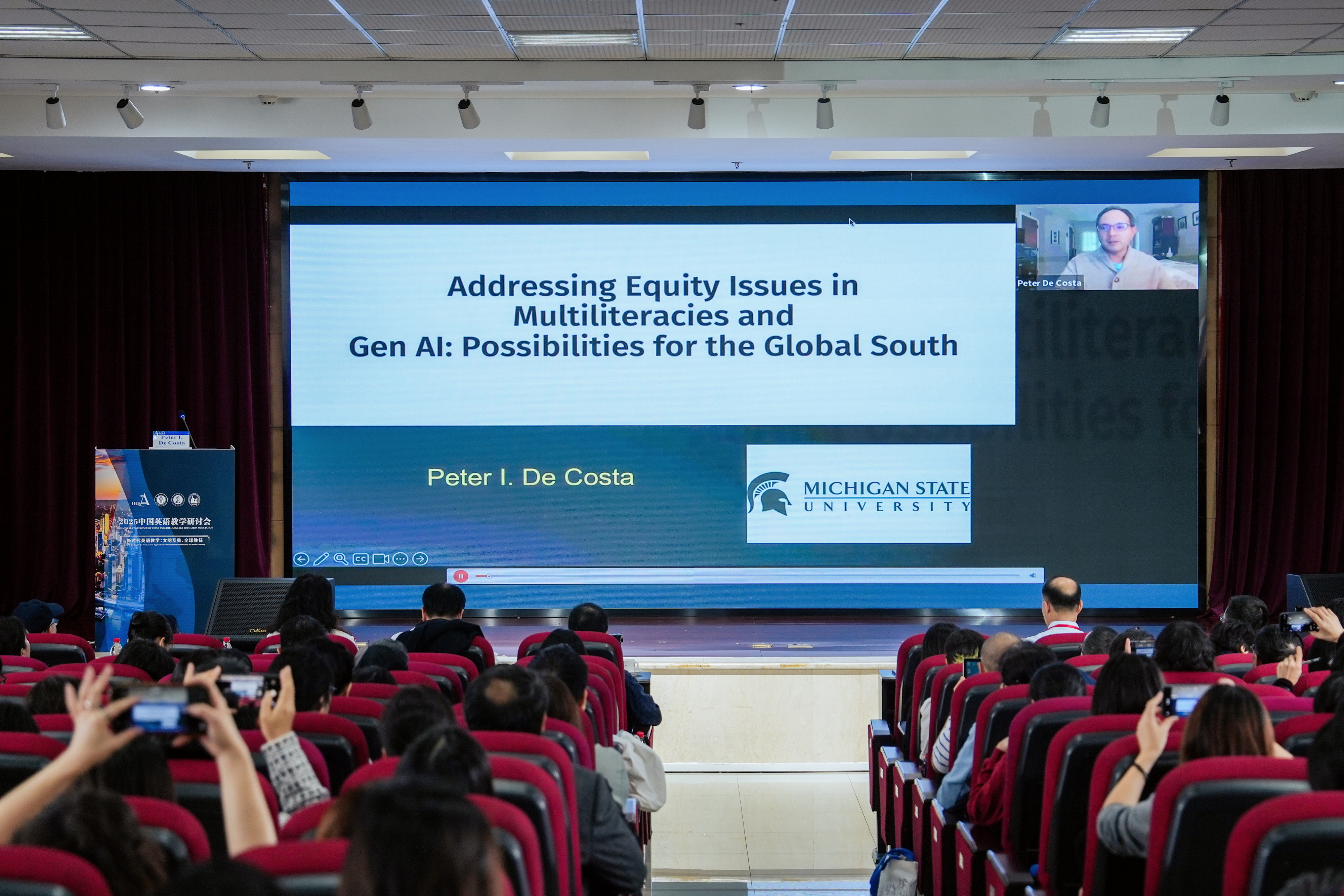 美国密歇根州立大学Peter I. De Costa教授作了题为“Addressing Equity Issues in Multiliteracies and GenAI: Possibilities for the Global South”的报告。De Costa教授指出,生成式人工智能(GenAI)背景下,批判性数字素养是师生需要培养的核心能力,并结合两项研究,深入探讨了情感、身份认同、意识形态和权力关系与教育教学实践之间的紧密联系。同时,他提醒关注GenAI可能带来的刻板印象等伦理风险及其可能加剧全球北方与全球南方之间的鸿沟。最后,他从基于特定平台的素养与身份认同、口音偏见、批判性数字素养课程设计等四个方面展望未来研究议题,并呼吁教师协力开展研究,共同推动教育公平。