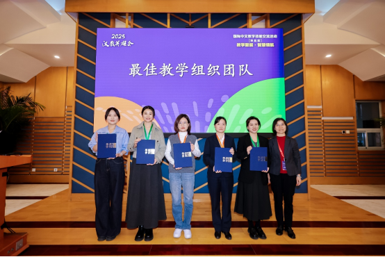 在闭幕式环节,外研社中国语言文化出版分社社长鞠慧表示,本次交流活动充分展现华北区各校师生的传承与创新,生动诠释了国际中文教育事业薪火相传的精神。期待更多师生能够积极参与、密切关注并深入研究“汉教英雄会”这一教学交流平台,共同携手推动国际中文教育事业的繁荣与发展。活动尾声,伴随着欢快的音乐和热烈的掌声,点评专家为2025“汉教英雄会”国际中文教学技能交流活动(华北区)的优秀团队颁发荣誉证书。会场洋溢着收获的喜悦和依依不舍的情谊,为这场充满智慧与温度的教学盛会画上了圆满的句号。