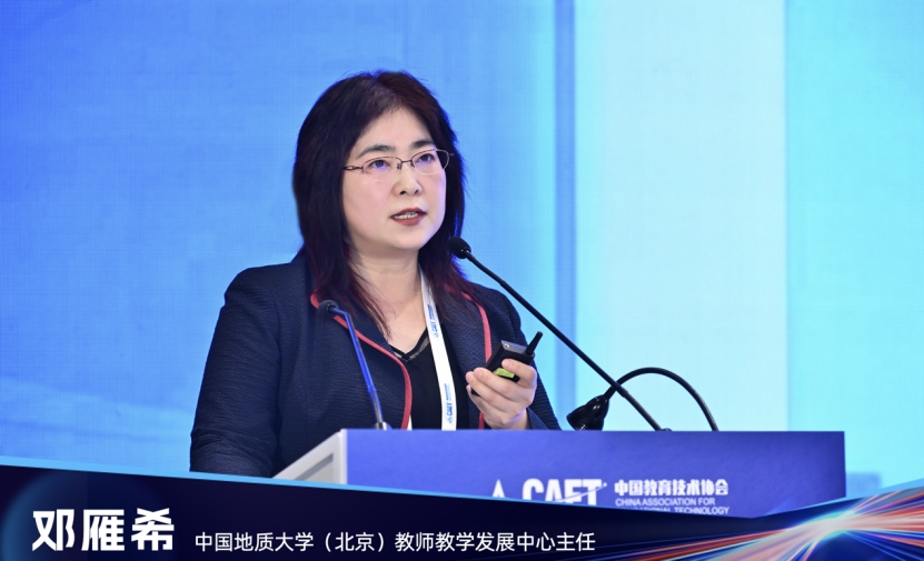 中国地质大学(北京)教师教学发展中心主任邓雁希聚焦“高校教师数字素养提升的模式创新与实践探索”。她指出,学校构建“诊、训、赛、研”一体化教师数字素养提升体系,利用iTeach平台完成近700名全职教师的数字素养诊测,总体评估教师数字素养五大维度中的优势和不足,制定有针对性、分层分类的数字素养强化研训方案,通过线上线下混合式、实操型工作坊以及“校—市—全国三级比赛体系”,鼓励教师将人工智能技术融入教育教学全流程,“以赛促教、以研促改”的骨干教师数字素养提升及培养模式稳步完善。