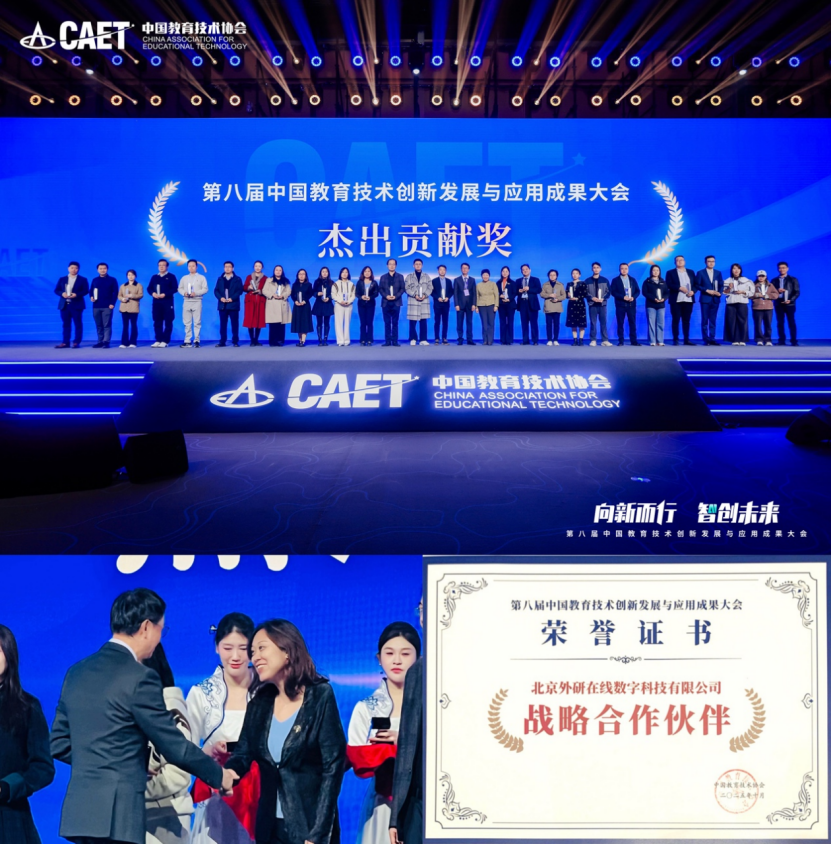 外研在线也正是因为此类在教育技术创新领域的积极探索与卓越成就,得到上级主管部门充分认可,成为本次大会战略合作伙伴,并获评“杰出贡献奖”。