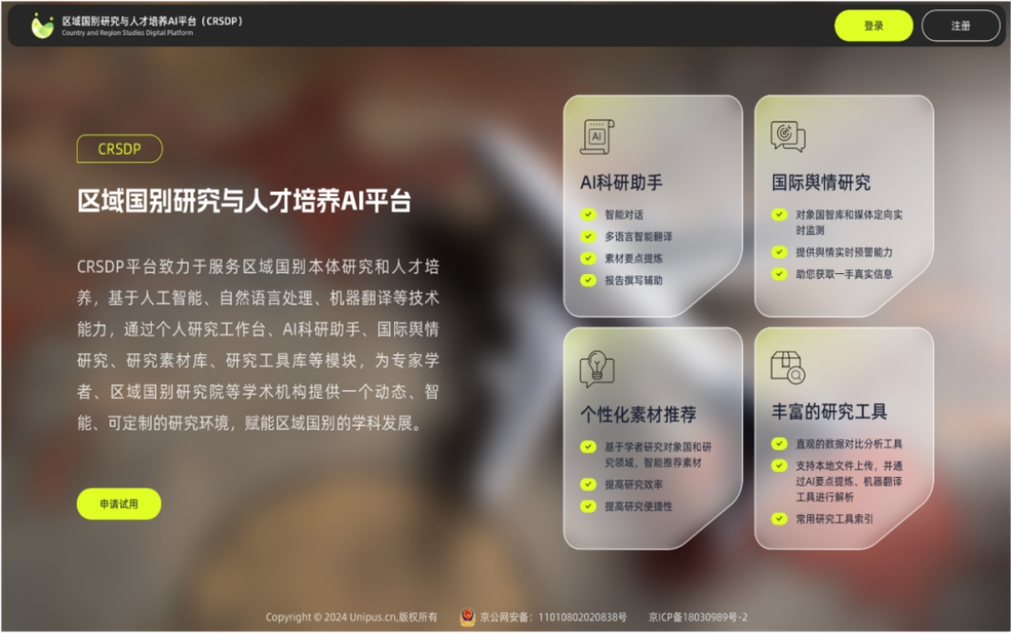 平台深度融合人工智能技术,提供AI助手工具、内置翻译引擎、配套多学科知识图谱,助力研究者沉淀交叉学科教研成果,为区域国别学的本体研究、课程建设、学术科研及人才培养提供一体化智能解决方案,系统构建“语言+对象国知识+跨学科能力”培养体系。同时,可通过智能工具支持国情动态分析、研究资料挖掘、跨文化模拟实训等功能,有效推动“心转、软转、硬转”三层次转型策略的实施落地。