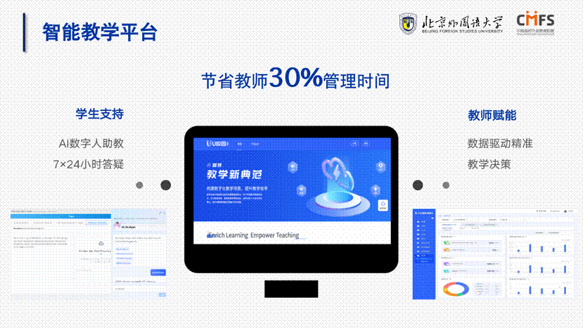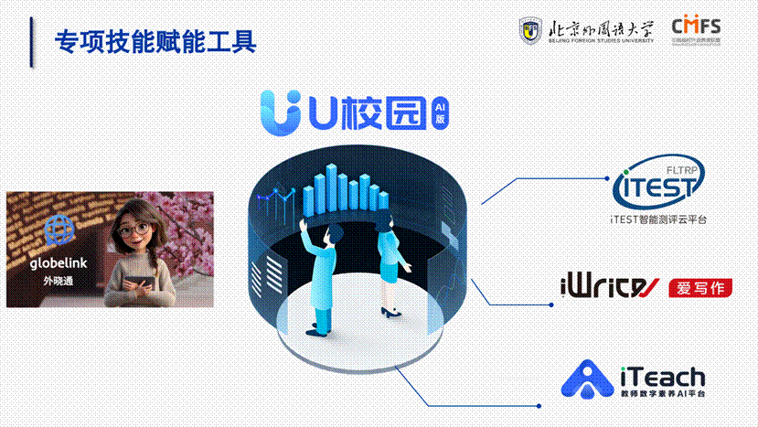 数智化是手段,北外以智能基座为引擎,实现数据驱动的个性化教学:打造以U校园AI版为核心一体化智能教学平台生态,开发iWrite、iTEST等专项技能赋能工具,研发校园专属智能中枢“外晓通”,依托iTeach平台创新教师发展模式,多措并举构建感知灵敏、分析精准、干预智能的教育新样态,让因材施教得以规模化实现。