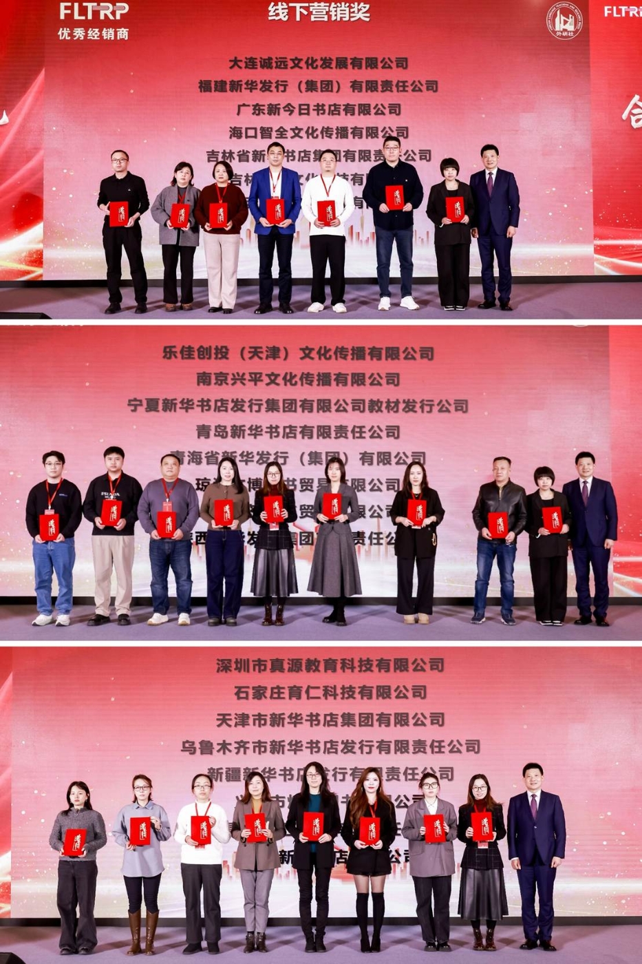 2025年,外研社与渠道合作伙伴紧密配合,挖掘潜力,再创佳绩。大会对业绩突出的优秀合作伙伴进行表彰,颁发金牌采购奖、新媒体营销奖、线上营销奖、创新领航奖、线下营销奖、教材营销奖、最佳合作伙伴奖等奖项。