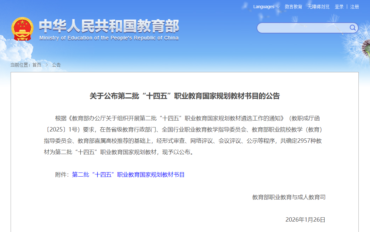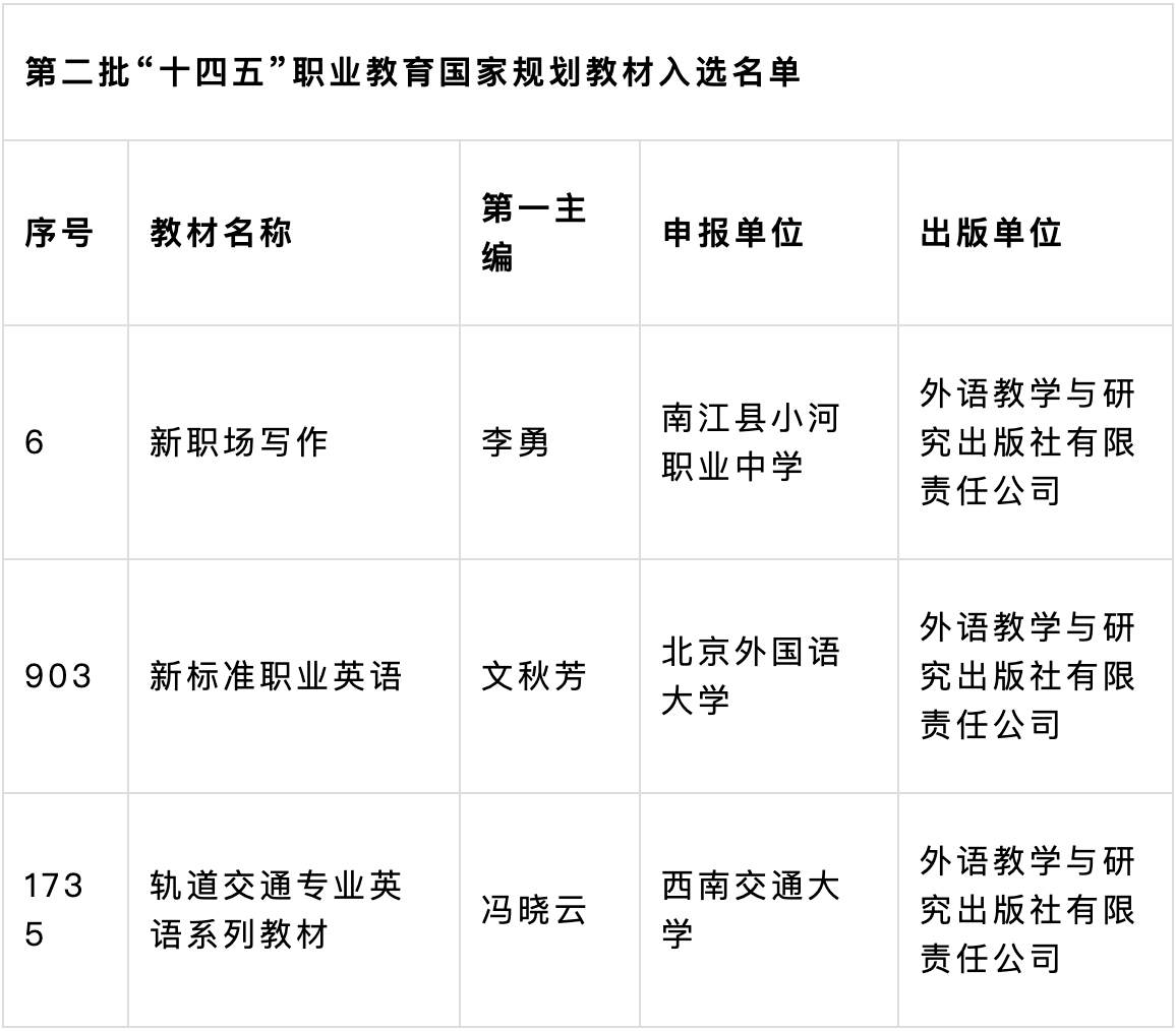 近日,教育部职业教育与成人教育司公布第二批“十四五”职业教育国家规划教材书目,外研社共有3种教材成功入选,这一殊荣充分展示了外研社在职业教育领域的专业积淀与创新能力。