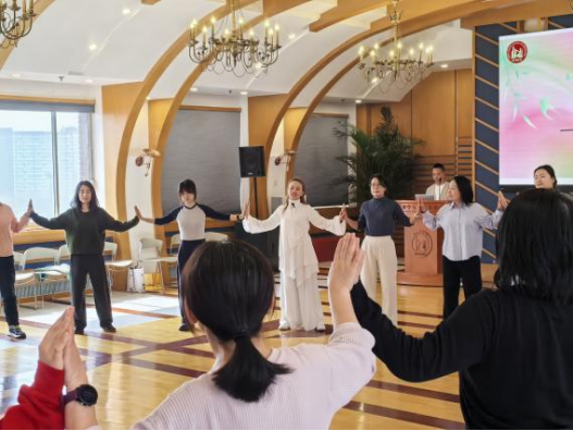 本次疗愈活动设计独具匠心。形体舞蹈老师梁铧月精心编排活动内容,将舞动、呼吸、冥想等多元身心疗愈方式融入活动。伴随着习习春风、潺潺溪水、阵阵鼓声交织而成的音乐背景,女职工们从敞开心扉的自我介绍开始,以“土元素”舞蹈逐渐进入氛围,以“火元素”舞蹈绽放身体力量,以“水元素”舞蹈彻底放松身心,释放压力与疲惫,感受舒展的生命力。在静谧的冥想环节,大家通过深长而有节奏的呼吸练习,使身体和大脑得到彻底放松,在疗愈师的引导下,感知自己的身体与内心,体悟从容与平静的能量。