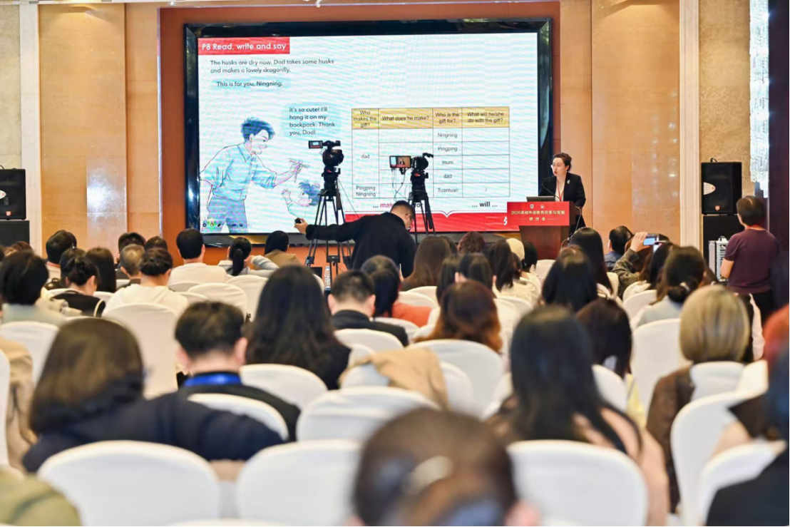 白玉探讨了以英语阅读支撑中国文化传播的育人理念与实践路径。她在报告中指出,用英语讲好中国故事是新时代英语学科的核心育人目标,而阅读是实现这一目标的关键赋能路径。它通过引导学生深入理解蕴含中国文化的文本内涵,在提升其跨文化沟通与叙事能力的同时,内化对中华文化的认同,并最终树立坚定的文化自信,实现立德树人的根本目标。针对实践中“素材筛选难、教材融合难、路径构建难”三大难题,她立足哈尔滨本地特色,充分挖掘剪纸、亚冬会等本土文化资源,将学生的身边事、家国情与《悦读中国》绘本教学有机融合。在此基础上,她提炼出“一标·双轨·三阶·四核心”的英语阅读跨学科实践路径,利用多元、真实的语料,切实赋能学生用英语讲好中国故事。