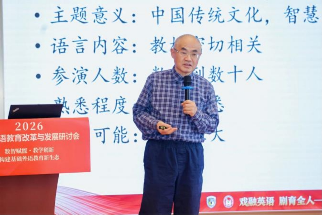 鲁子问作题为“从教材到舞台——课本剧变现的距离有多远”的主题发言。他表示,课本剧具有重要的教育价值,国家需要戏剧,教育需要戏剧,英语教育更需要戏剧。基于课标要求与教学实践,他指出,戏剧活动有助于提升学生的记忆、理解、表达与合作能力。随后,他梳理了从课本到舞台的实施路径,强调“台词剧本”向“舞台剧本”的转化是关键环节,需要将叙述语言和心理活动转化为动作、表情、走位以及灯光、音效、道具等舞台元素,AI可在改写过程中提供辅助。最后,他强调,剧本只是基础,排练才是真正的学习,唯有在反复排练、展演与反思中,才能实现从课本理解到语言运用的转化。