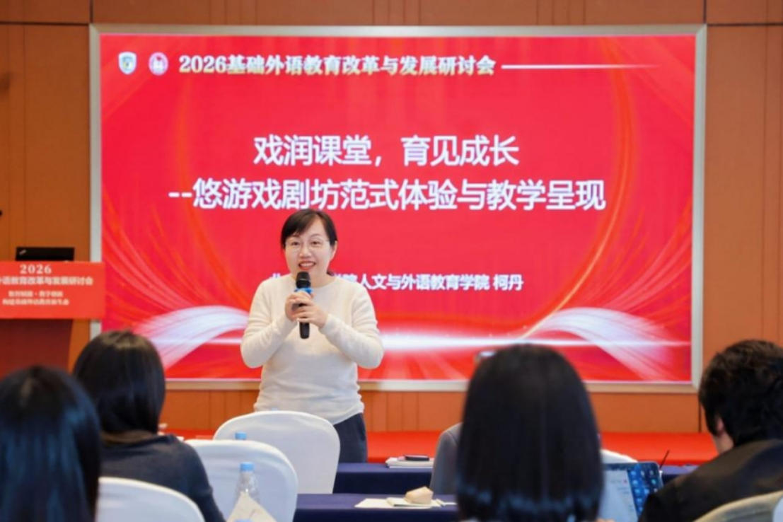 柯丹作题为“戏润课堂,育见成长——悠游戏剧坊范式体验与教学呈现”的主题发言。她以《悠游素养系列·戏剧坊·中国故事剧》为例,带领现场老师沉浸式体验教育戏剧课堂活动。围绕“读前——读中——读后”的教学流程,她展示了教育戏剧如何通过空间建构、角色体验、情境表演和反思表达等方式,推动学生深入理解文本、唤起情感共鸣、发展思维能力。整场分享突出“在体验中学习、在参与中成长”的理念,展现了教育戏剧在激活课堂氛围、增强表达勇气、提升合作能力和学习投入度方面的独特价值,为教师开展融合型英语课堂教学提供了生动启发。