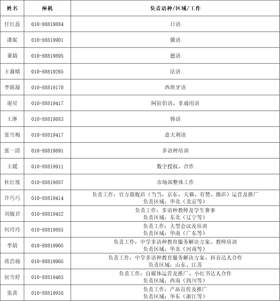 日、韩、德、法、俄、西、意等语言(外语专业、二外、培训机构和学校、企业培训)教材咨询、市场推广、配套教育服务支持,请联系“综合语种教育出版分社”: